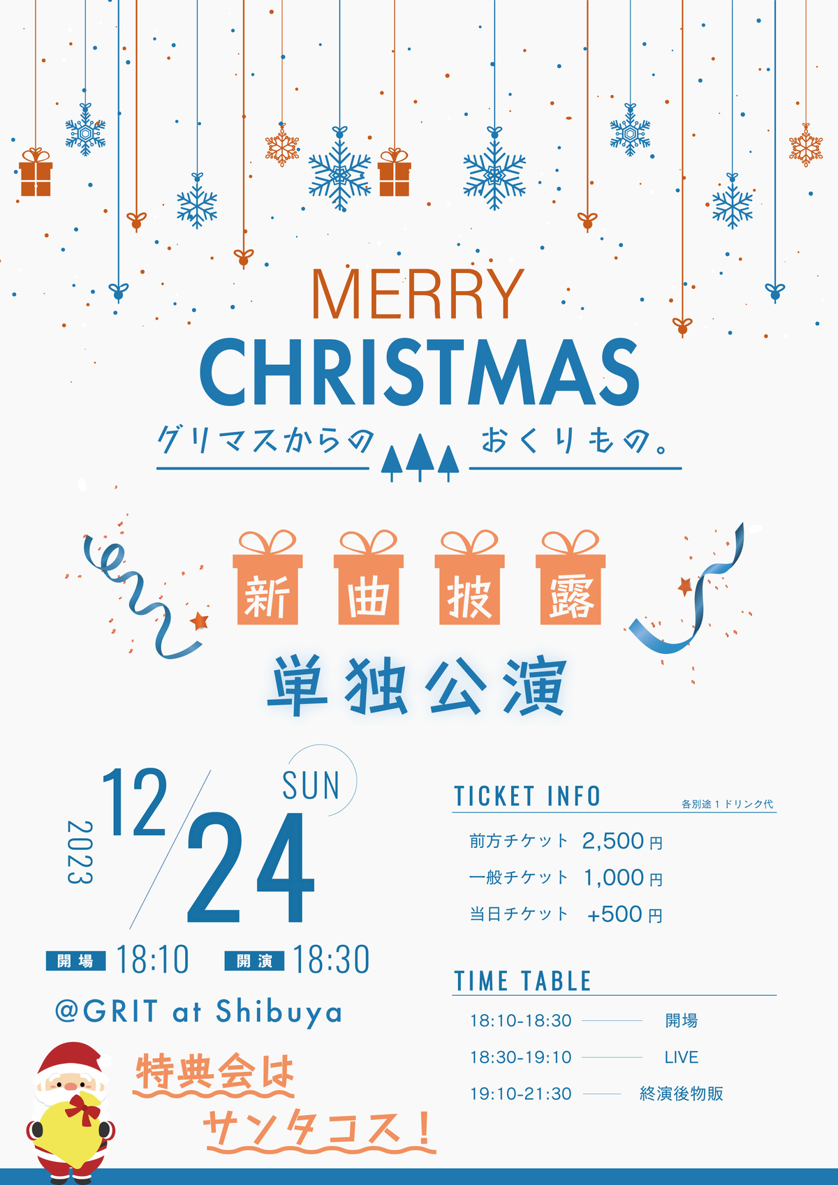 Schedule BACK TO LIST 2023.12.24[Sun] GRIT at Shibuya 新曲お披露目単独公演「グリマスからのおくりもの。」 『新曲お披露目単独公演「グリマスからのおくりもの。」』 ■GRIT at Shibuya ■開場18:10 / 開演18:30 ■前方チケット2,500円 / 一般チケット1,000円(各別途1D) 当日券+500円 VENUE GRIT at Shibuya TIME 開場 / 0:00 開演 / 0:00 TICKET 前売 未定 / 当日 未定 ACT