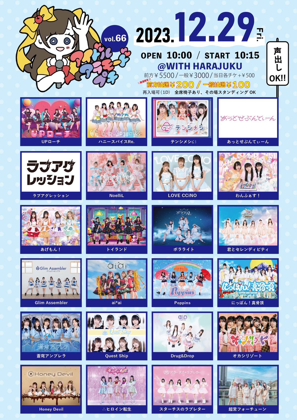 Schedule BACK TO LIST 2023.12.29[Fri] WITH HARAJUKU HALL アイドルアラモードプチVol.66 『アイドルアラモードプチVol.66』 ■WITH HARAJUKU HALL ■開場10:00 / 開演10:15 ①数量限定特別チケット 前方エリア抽選200円/一般エリア抽選100円 ※抽選予約12/11(月)19:00~21:59 ②前方エリア5500円/一般エリア3000円 ※チケット発売12/11(月)23:00~ 各チケット別途1D VENUE WITH HARAJUKU HALL TIME 開場 / 10:00 開演 / 10:15 TICKET 前売 ¥ 3,000 / 当日 ¥ 3,500 ACT