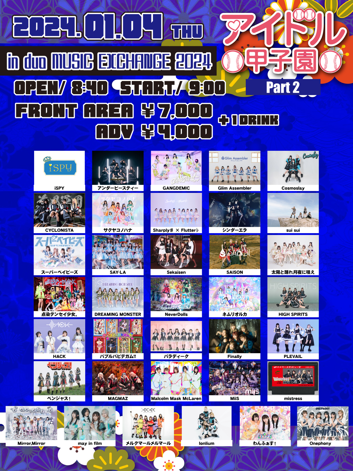 Schedule BACK TO LIST 2024.1.4[Thu] duo MUSIC EXCHANGE アイドル甲子園 in duo MUSIC EXCHANGE 2024 PART2 2024年1月4日(木) 『アイドル甲子園 in duo MUSIC EXCHANGE 2024 PART2』 ■duo MUSIC EXCHANGE ■開場8:40 / 開演9:00 VENUE duo MUSIC EXCHANGE TIME 開場 / 8:40 開演 / 9:00 TICKET 前売 ¥ 4,000 / 当日 ¥ 4,500 ACT