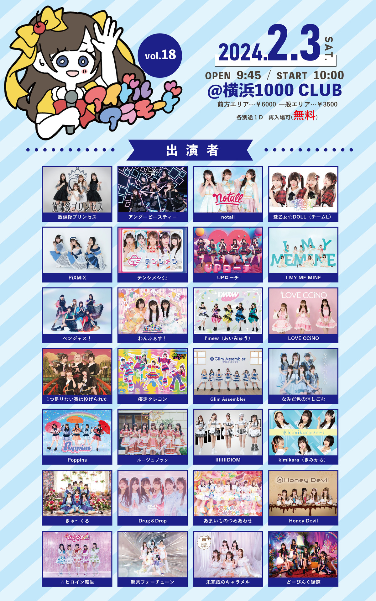 Schedule BACK TO LIST 2024.2.3[Sat] 横浜1000CLUB アイドルアラモードVol.18 『アイドルアラモードVol.18』 ■ 横浜1000 CLUB ■ 開場09:45 / 開演10:00 VENUE 横浜1000CLUB TIME 開場 / 0:00 開演 / 0:00 TICKET 前売 未定 / 当日 未定 ACT
