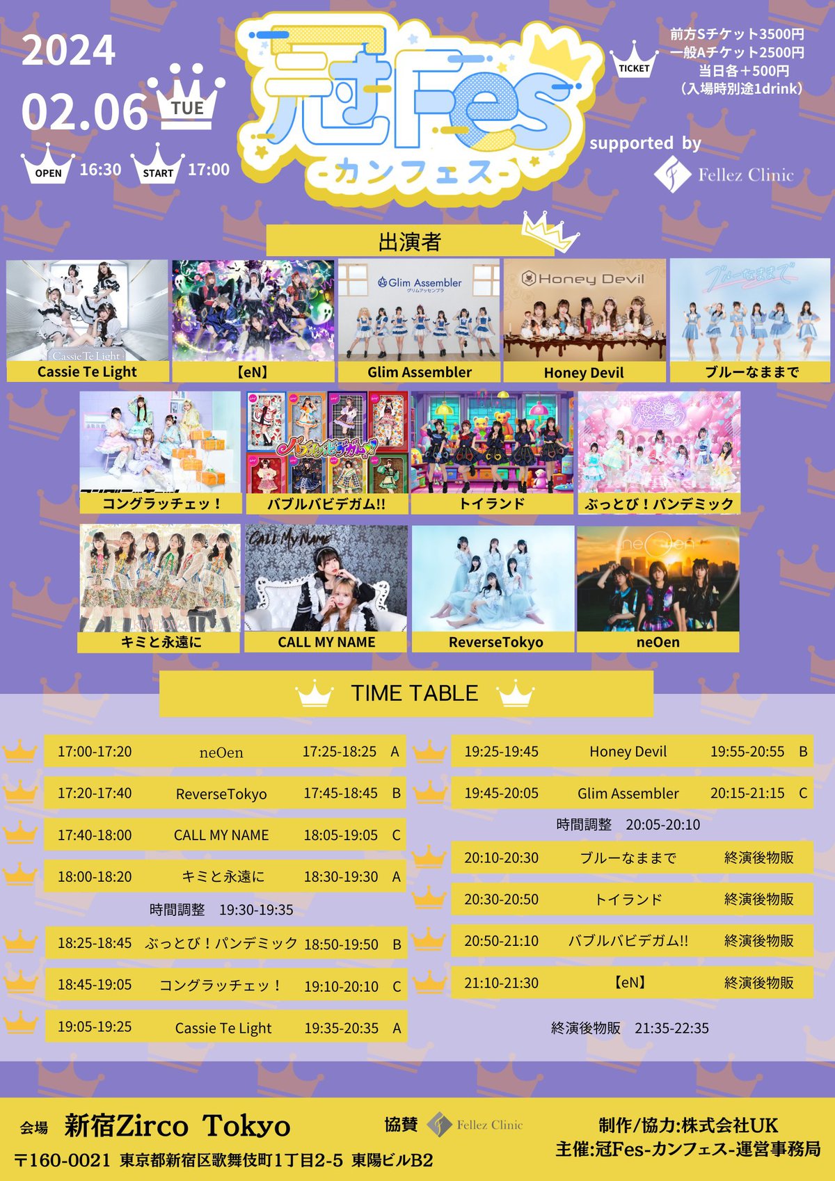 Schedule BACK TO LIST 2024.2.6[Tue] Zirco Tokyo 冠Fes-カンフェス- 『冠Fes-カンフェス-』 ■Zirco Tokyo ■開場16:30 / 開演17:00 VENUE Zirco Tokyo TIME 開場 / 0:00 開演 / 0:00 TICKET 前売 未定 / 当日 未定 ACT