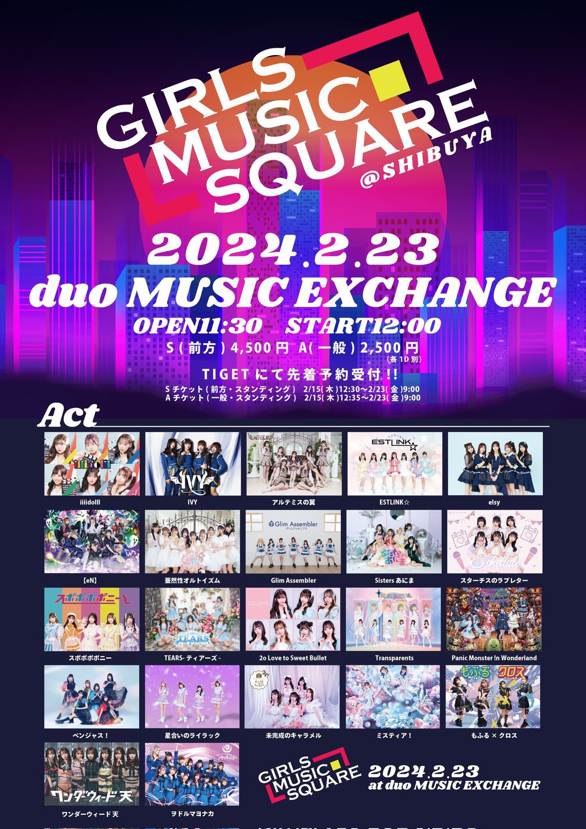 Schedule BACK TO LIST 2024.2.23[Fri] duo MUSIC EXCHANGE GIRLS MUSIC SQUARE 『GIRLS MUSIC SQUARE』 ■duo MUSIC EXCHANGE ■開場11:30 / 開演12:00 ■Sチケット(前方)4,500円 / Aチケット(一般)2,500円(各1D別) VENUE duo MUSIC EXCHANGE TIME 開場 / 0:00 開演 / 0:00 TICKET 前売 未定 / 当日 未定 ACT