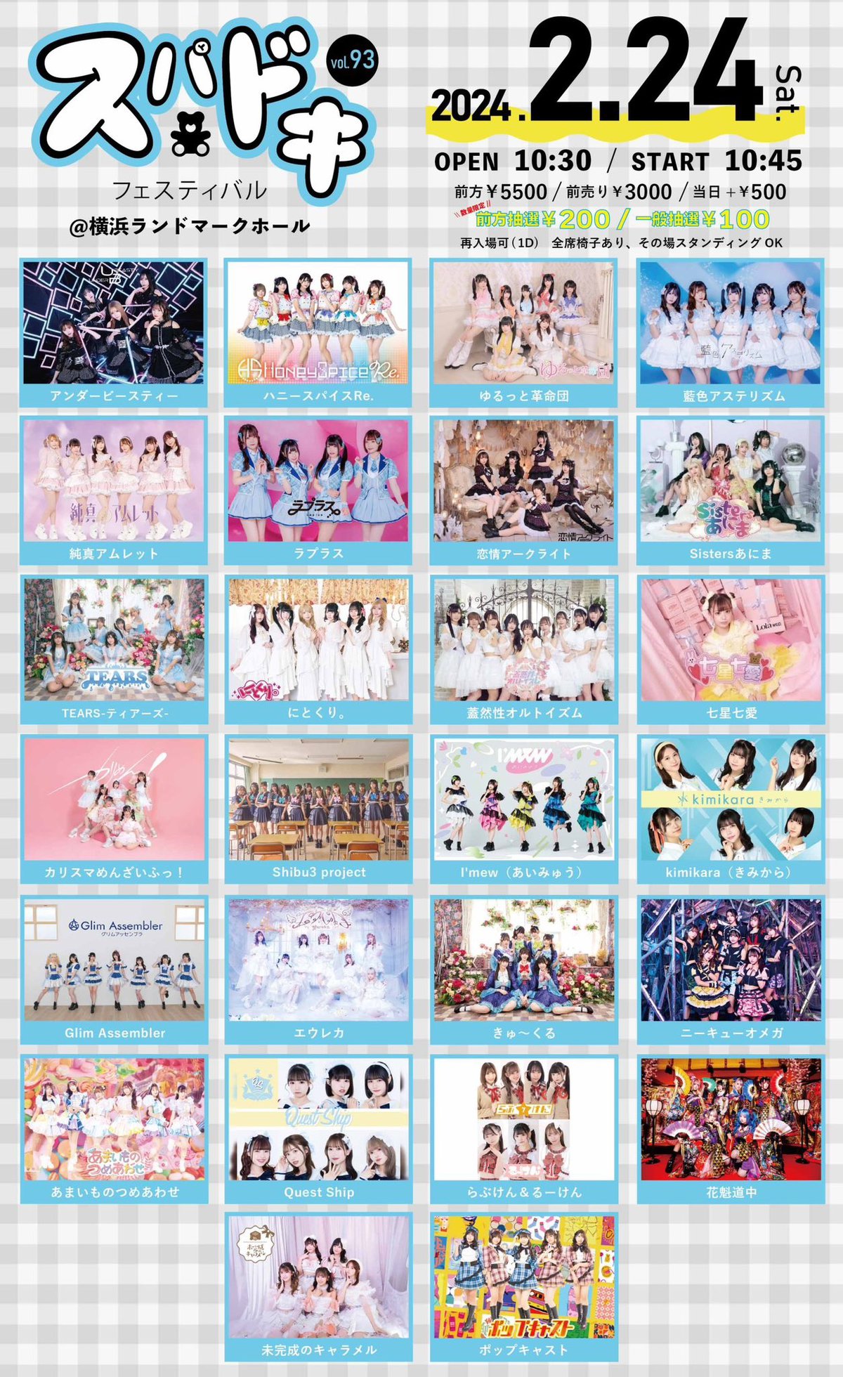 Schedule BACK TO LIST 2024.2.24[Sat] 横浜ランドマークホール スパドキフェスティバルVol.93 『スパドキフェスティバルVol.93』 ⬛︎横浜ランドマークホール ⬛︎開場10:30 / 開演10:45 ⬛︎前方エリア5500円/一般エリア3000円(各チケット別途1D) VENUE 横浜ランドマークホール TIME 開場 / 0:00 開演 / 0:00 TICKET 前売 未定 / 当日 未定 ACT