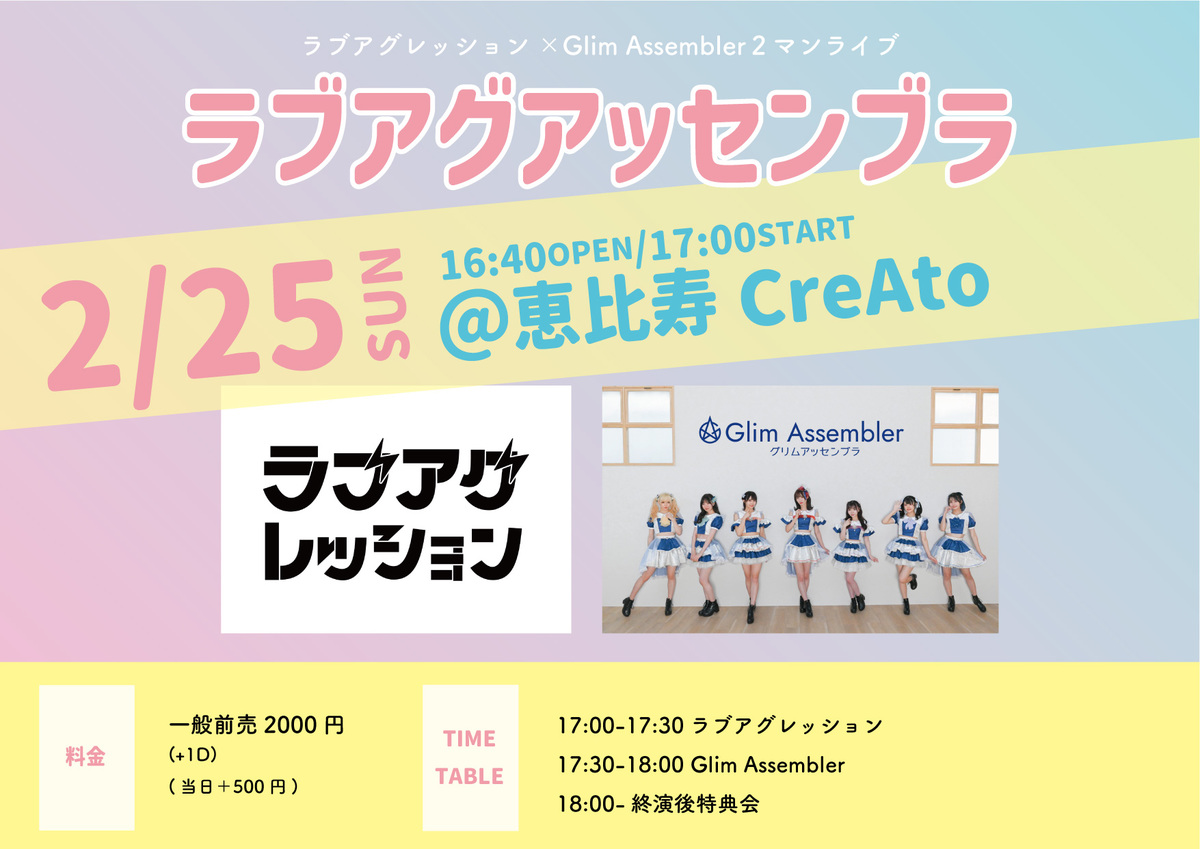 Schedule BACK TO LIST 2024.2.25[Sun] 恵比寿CreAto ラブアグアッセンブラ 『ラブアグアッセンブラ』 ■恵比寿CreAto ■16:40開場 / 17:00開演 ■前売チケット 2,000円(※別途1D) VENUE 恵比寿CreAto TIME 開場 / 0:00 開演 / 0:00 TICKET 前売 未定 / 当日 未定 ACT