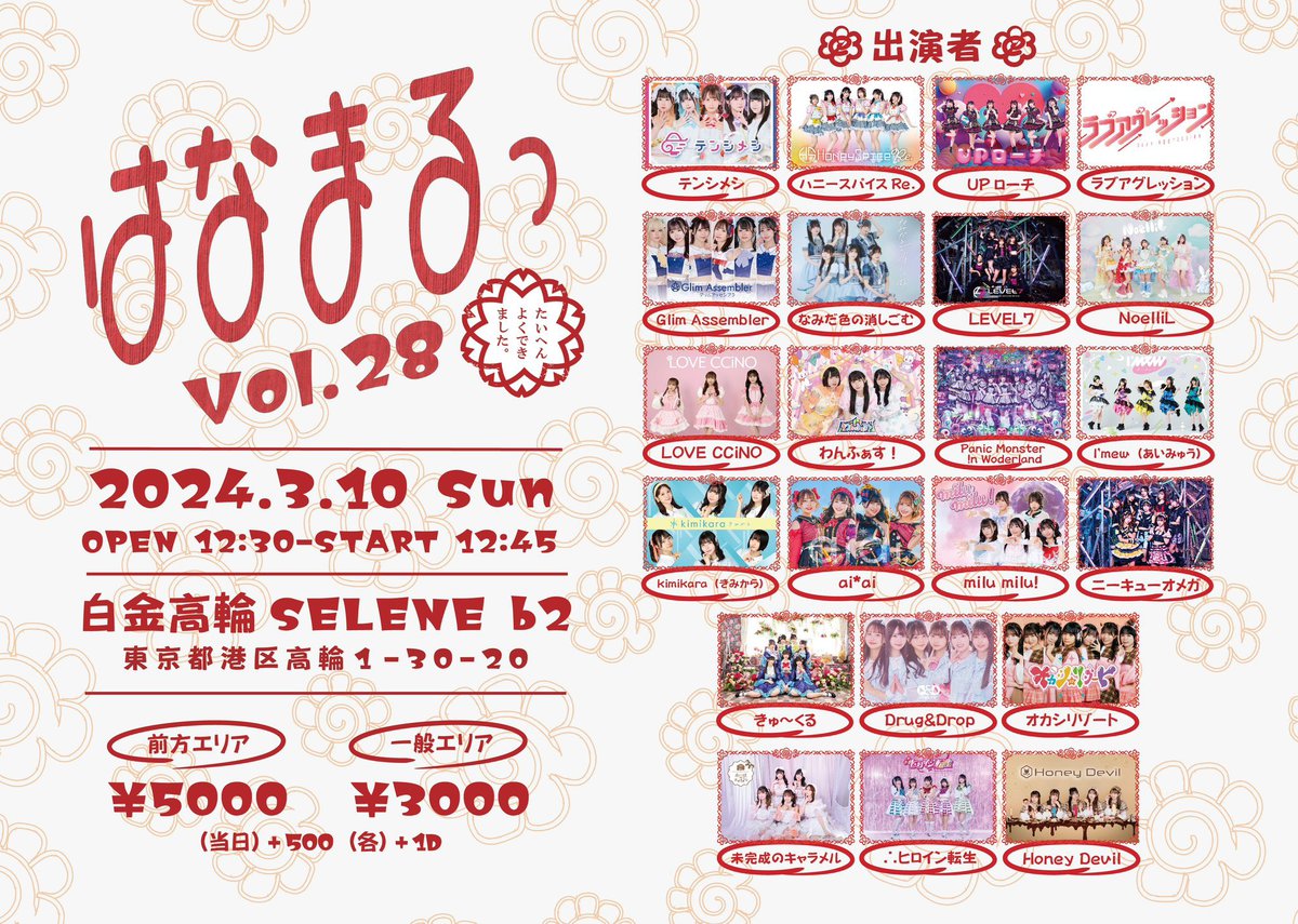 Schedule BACK TO LIST 2024.3.10[Sun] 白金高輪SELENE b2 はなまるっ Vol.28 「はなまるっ Vol.28」 ■白金高輪SELENE b2 ■開場12:30 開演12:45 ■前方エリア5,000円 / 一般3,000円(別途1D) 当日各+500円 VENUE 白金高輪SELENE b2 TIME 開場 / 0:00 開演 / 0:00 TICKET 前売 未定 / 当日 未定 ACT