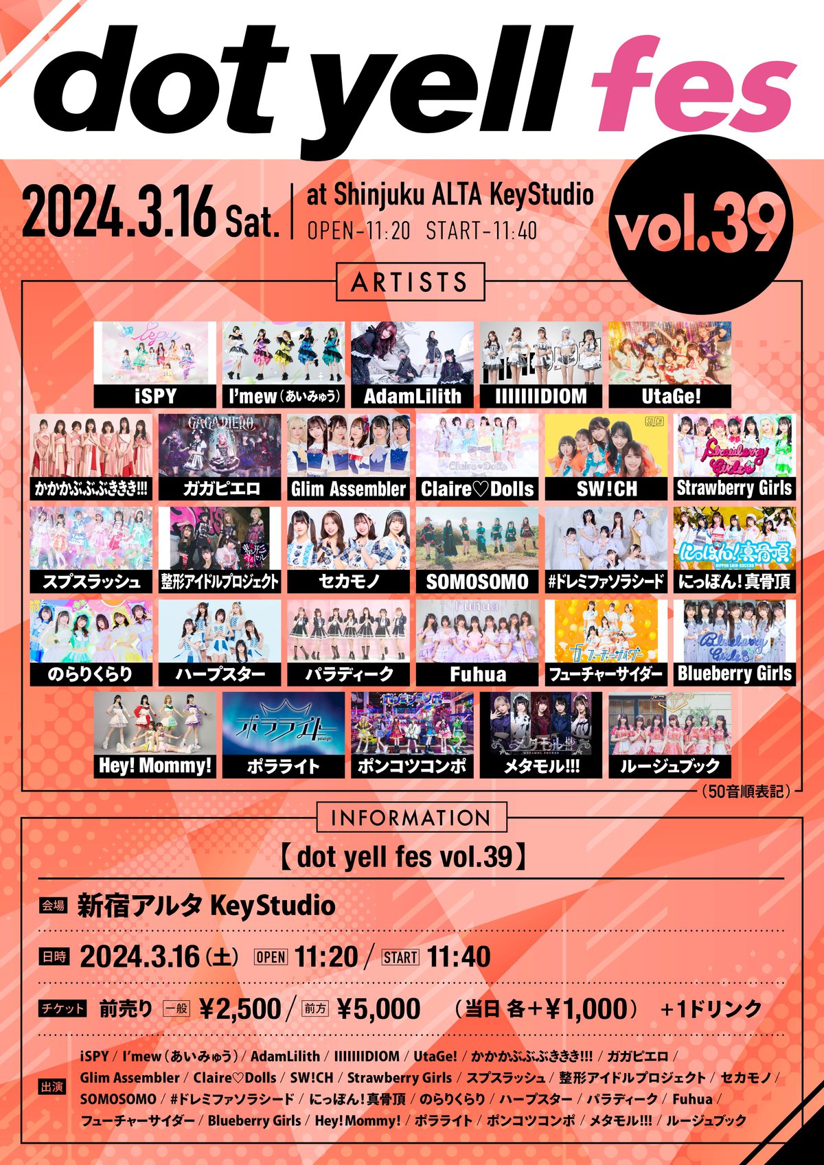 Schedule BACK TO LIST 2024.3.16[Sat] 新宿 KeyStudio dot yell fes vol.39 3月16日(土) 『dot yell fes vol.39』 ■新宿アルタ KeyStudio ■OPEN 11:20 / START 11:40 VENUE 新宿 KeyStudio TIME 開場 / 0:00 開演 / 0:00 TICKET 前売 未定 / 当日 未定 ACT