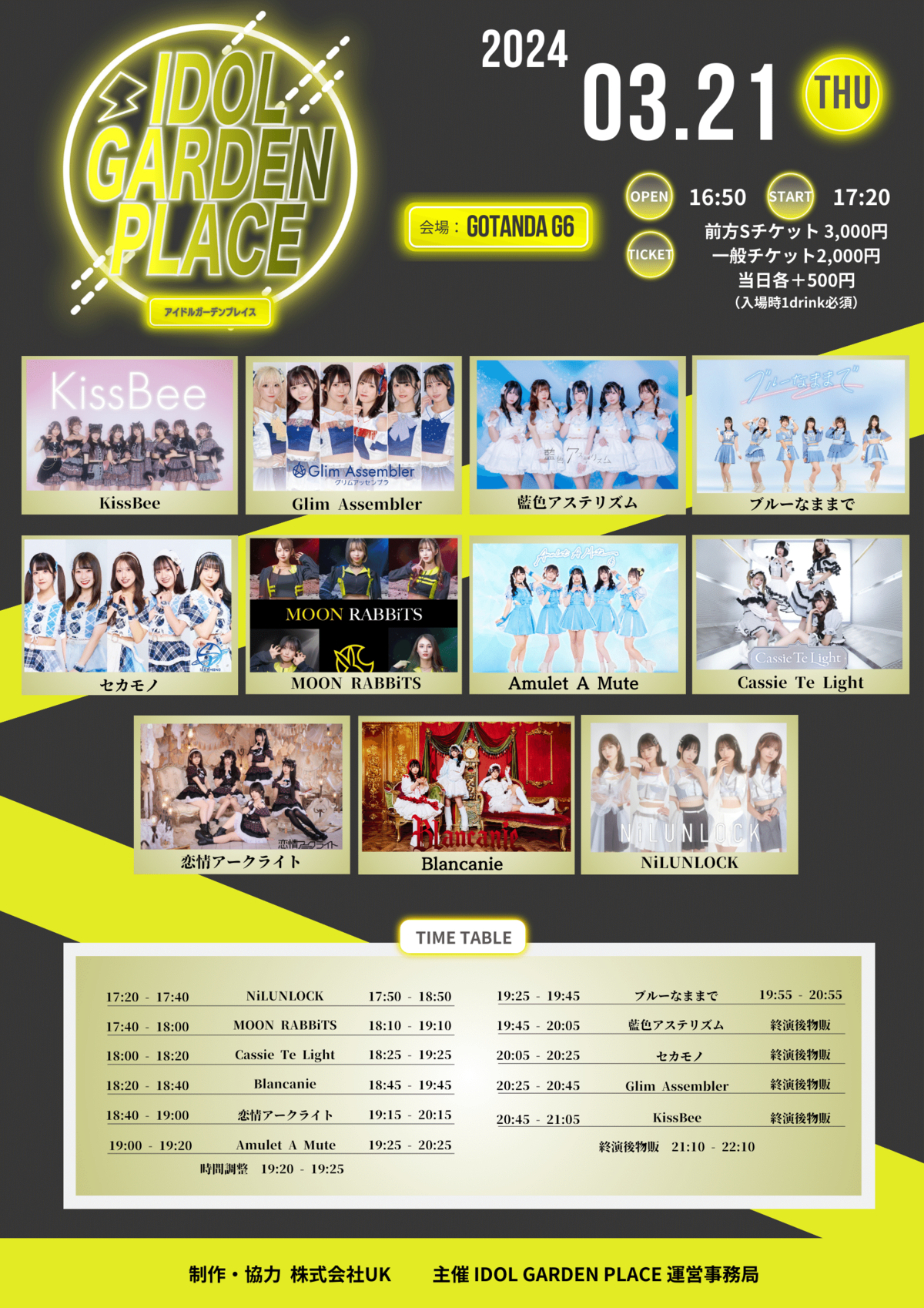 Schedule BACK TO LIST 2024.3.21[Thu] GOTANDA G6 IDOL GARDEN PLACE 『IDOL GARDEN PLACE』 ■GOTANDA G6 ■開場16:50 / 開演17:20 VENUE GOTANDA G6 TIME 開場 / 0:00 開演 / 0:00 TICKET 前売 未定 / 当日 未定 ACT