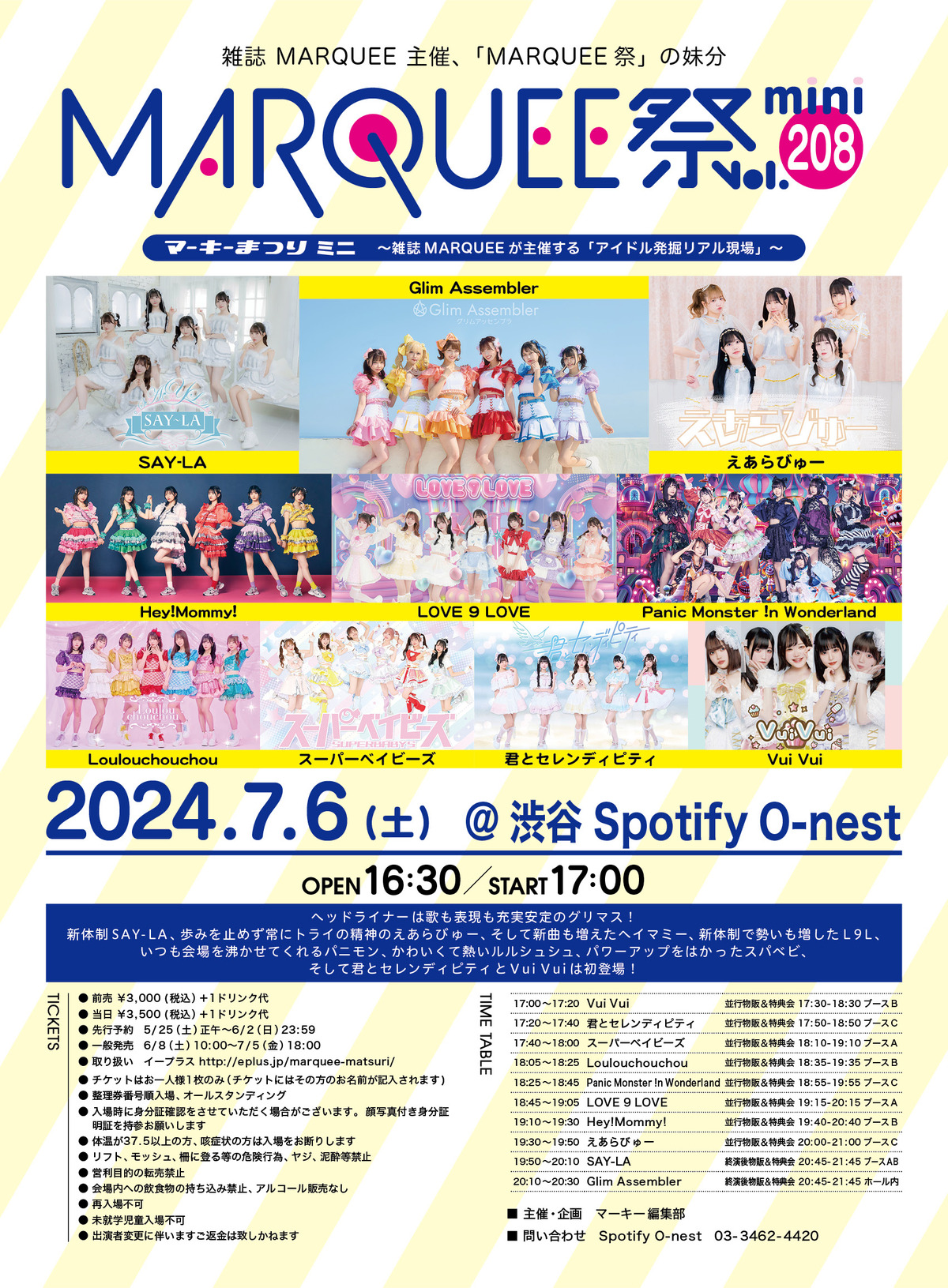 Schedule BACK TO LIST 2024.7.6[Sat] Spotify O-nest 『MARQUEE祭mini Vol.208』 ■Spotify O-nest ■開場16:30 /開演17:00 VENUE Spotify O-nest TIME 開場 / 16:30 開演 / 17:00 TICKET 前売 未定 / 当日 未定 ACT