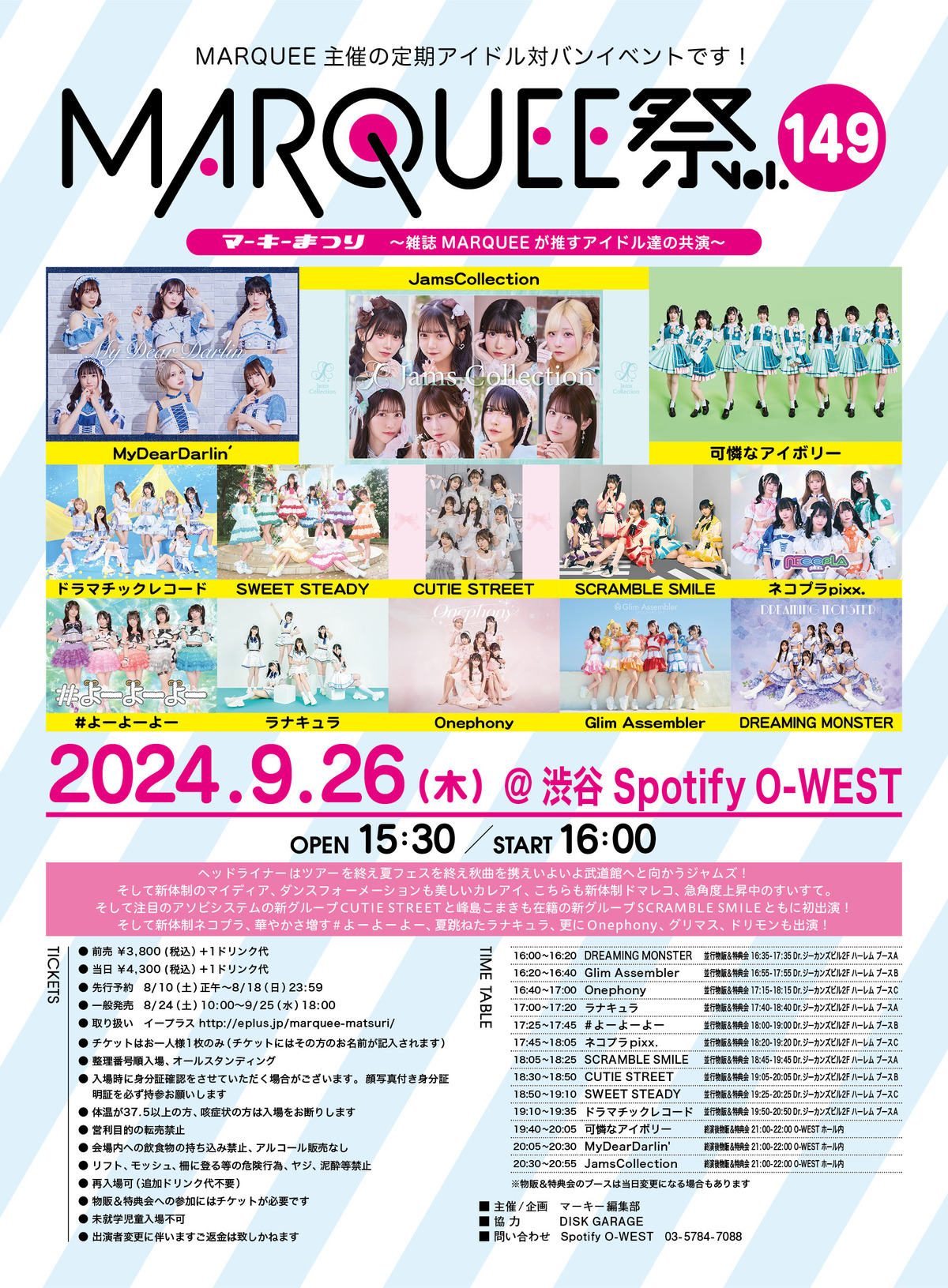 Schedule BACK TO LIST 2024.9.26[Thu] Spotify O-WEST MARQUEE祭Vol.149 『MARQUEE祭Vol.149』 ■Spotify O-WEST ■開場15:30 / 開演16:00 VENUE Spotify O-WEST TIME 開場 / 0:00 開演 / 0:00 TICKET 前売 未定 / 当日 未定 ACT
