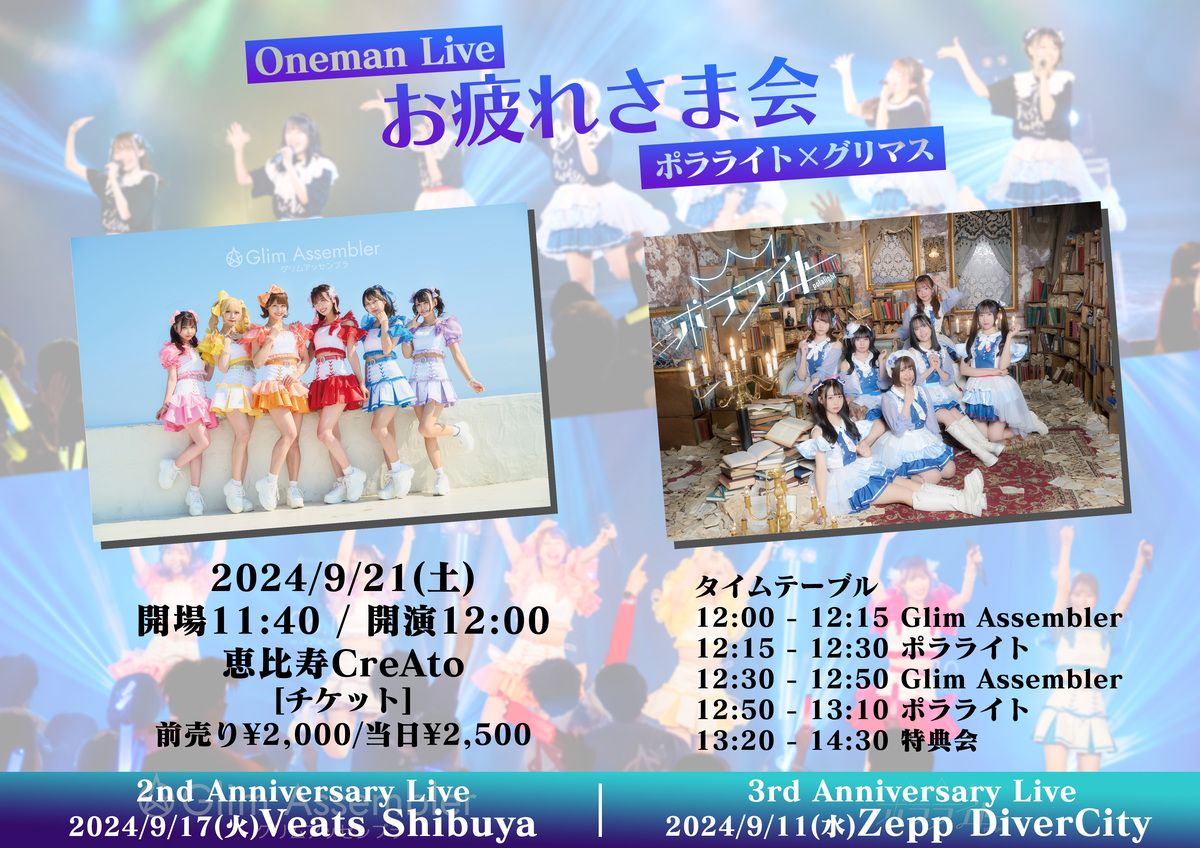 Schedule BACK TO LIST 2024.9.21[Sat] 恵比寿CreAto ワンマンライブお疲れさま会 『ワンマンライブお疲れさま会』 ■恵比寿CreAto ■開場11:40 / 開演12:00 VENUE 恵比寿CreAto 東京都渋谷区東3丁目14-19 オークヒルズ B1F TIME 開場 / 0:00 開演 / 0:00 TICKET 前売 未定 / 当日 未定 ACT