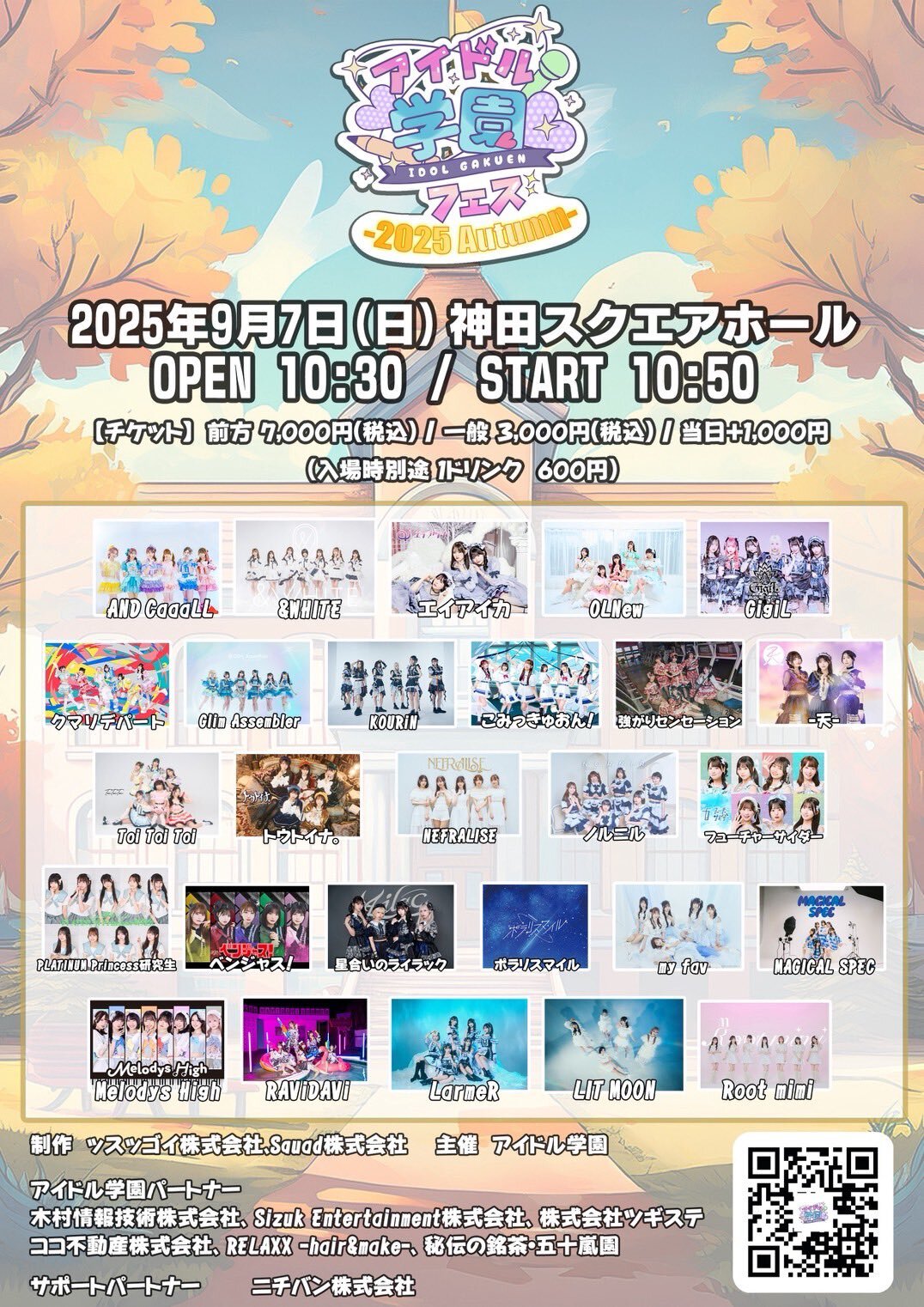 Schedule BACK TO LIST 2025.9.7[Sun] 神田スクエアホール アイドル学園フェス -2025 Autumn- ■ 神田スクエアホール ■ OPEN 10:30 / START 10:50 ■ 前方エリア¥7,000 / 一般3,000円 / +別途1d ■出演時間12:10-12:30 ■特典会 12:35-13:35[A] ■入場特典:ノーマルチェキ券 ▼チケットはこちら!(発売 8/25(月)18時~) t-dv.com/2025_09_07_idol VENUE 神田スクエアホール TIME 開場 / 0:00 開演 / 0:00 TICKET 前売 未定 / 当日 未定 ACT