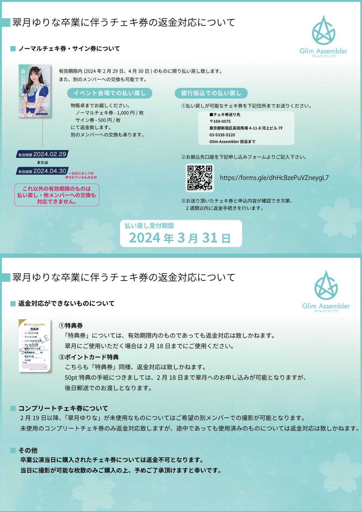 2024年2月18日の卒業公演をもちましてGlim Assemblerでの活動を終了する翠月ゆりなのチェキ券につきましてご案内申し上げます。