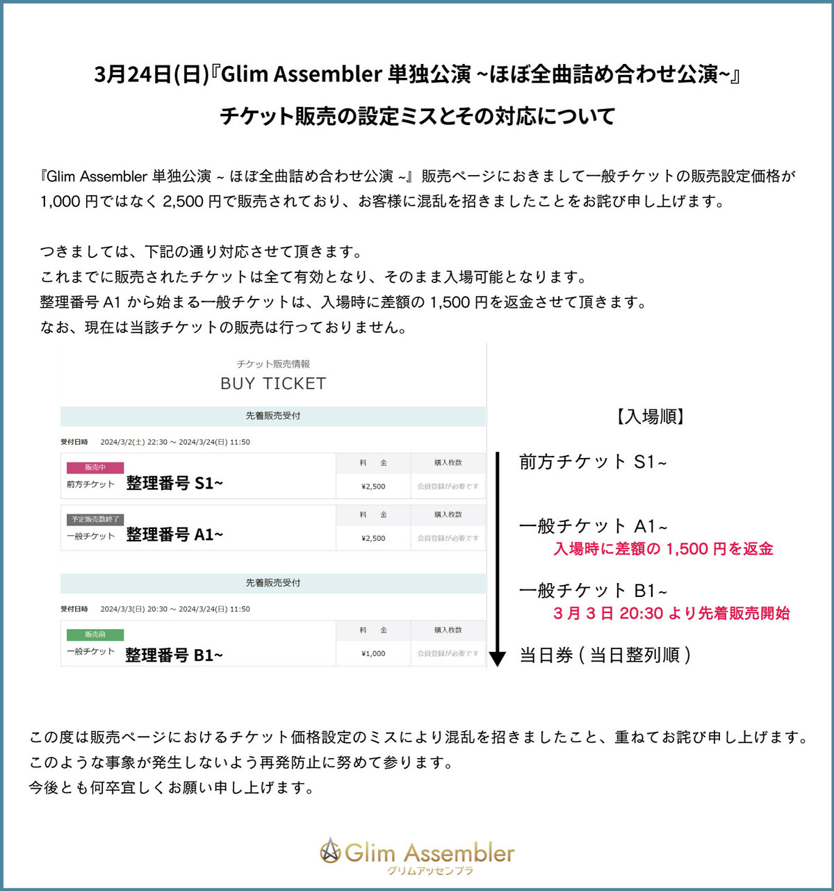 『Glim Assembler 単独公演 ~ほぼ全曲詰め合わせ公演~』販売ページにおきまして一般チケットの販売設定価格が1,000円ではなく2,500円で販売されており、お客様に混乱を招きましたことをお詫び申し上げます。
